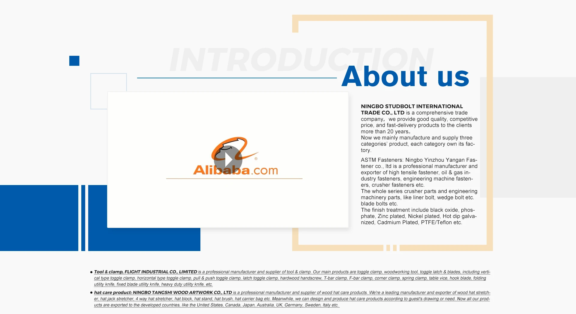 Productos principales:Abrazadera de palanca, A193 perno, camilla de sombrero de madera, piezas de trituradora, pestillo de palanca